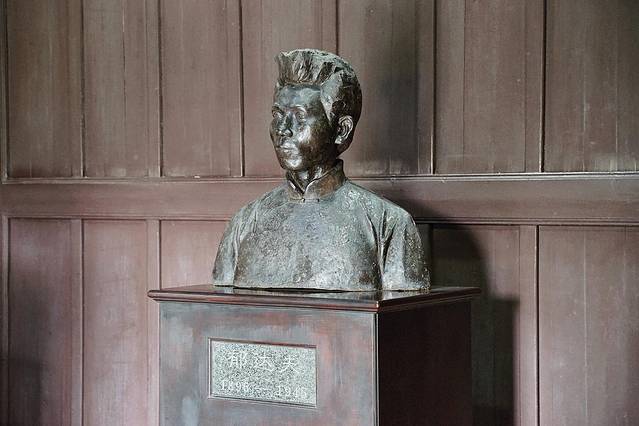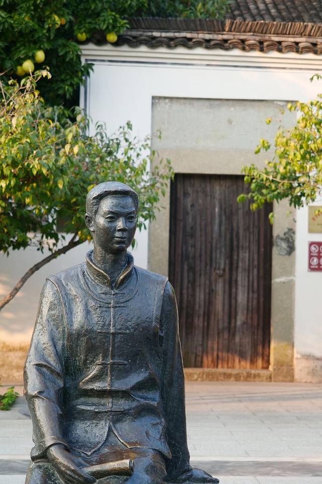 行至门口,蓦地从木门的缝隙里,望见这样一尊背影,在江面、垂柳中间,算不上伟岸,甚至有些落寞。他是一位文人,更是一位战士。1945年他在苏门答腊岛被日军杀害,再也没能回到他曾经眷恋着的故乡,再也没能看看他曾经无数次注视过的江水,没能再见到“痛爱你的明媚的湖山”。