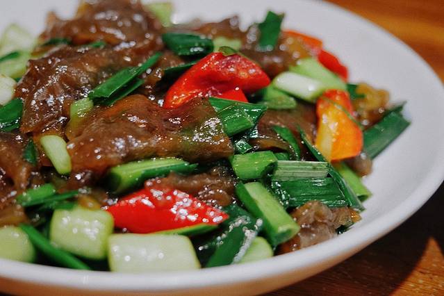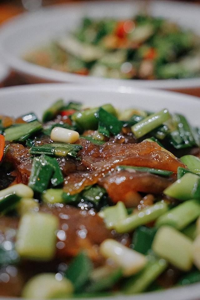 农家粉皮似乎更好地诠释了“用最朴素的食材创造最惊艳的味觉”,薄韧的粉皮被炒得“油韧有余”,搭配上大蒜叶和青红椒,成为了这一餐的不二之选。