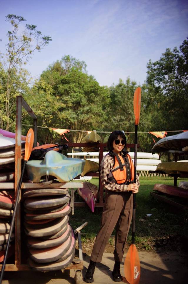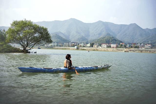 1小时的单人皮划艇99元一人,除了规定必须穿救生衣,在下水前工作人员还会进行一系列的培训。所有准备工作完毕,小艇晃晃悠悠地远离岸边,在不算剧烈的波浪的轻轻摆动下,来到了如画一般的江水中。