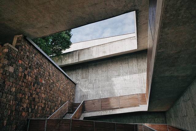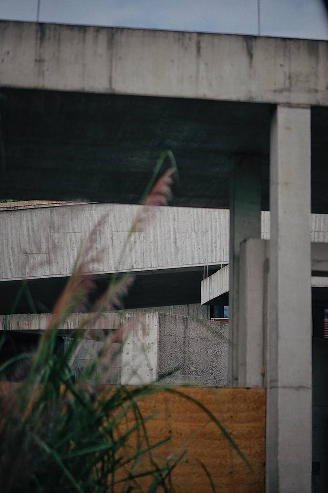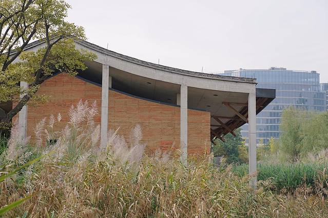 沿着廊道缓缓进入,一边是笔直的栏杆,另一侧则是一小片湖和几层小筑,湖中芦苇临风摇曳,建筑美与自然美在此完美地融合在了一起。
