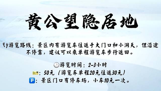 在这黄公望隐居地内,便是一步一景的观赏体验。正如画作手卷的观看方式是从右向左依次展开画卷,整个景区的布置也是一条笔直的线路,各个小景点就如画卷上的元素一般沿路径舒展开来:入口处是白鹤潭、黄公望纪念馆,而后沿着景区步道向内,依次是千年诗会、玄坛庙遗址、庙山船埠、结庐处牌坊、陆亭茶驿、黄公望雕像、庙坞竹径、筲箕碑亭、小洞天。从黄公望纪念馆到小洞天,大约有1km左右的路程,可以选择步行,也可以乘坐游览车。游览车只往返于黄公望纪念馆与小洞天之间,沿途不停靠,因而我们选择了乘车进步行出,可以细细地走访每一处景致。