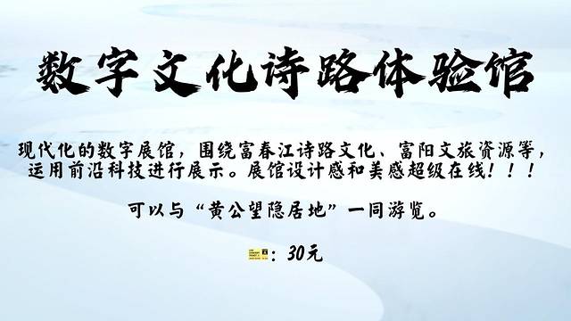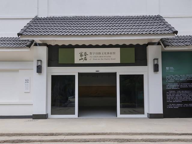 来到黄公望隐居地,千万别错过的,就是景区入口处的“数字文化诗路体验馆”,纯白的建筑,极简的落地窗,简明的写着“富春山居:数字诗路文化体验馆”。