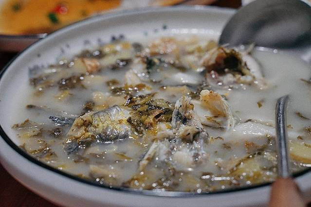 鱼缸里仅剩的两条汪刺鱼,被加入雪菜做成了汤。雪菜得倾情加入,使得这道菜鲜上加鲜。不同于平时菜场买到得汪刺鱼,这两条鱼是更健壮的“硬骨头”。吃完了眼前一桌珍馐美味,用老板娘刚刚做出的煎饼当了主食,又喝下一碗鲜香无比热气腾腾的汤,春江小城的夜晚,果然让人无比愉快。