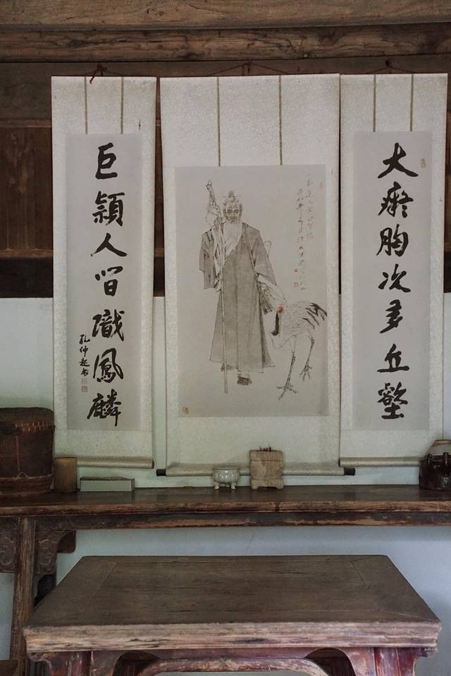 室内可以进入,首先映入眼帘的是一幅老人与仙鹤的肖像画作,以及一副对联,房间一隅,一次是灶台与生活用具。虽不是真正使用过的旧物,但古色古香的布置,还是让人仿佛一下子穿越到“采菊东篱下,悠然见南山”的意境当中。