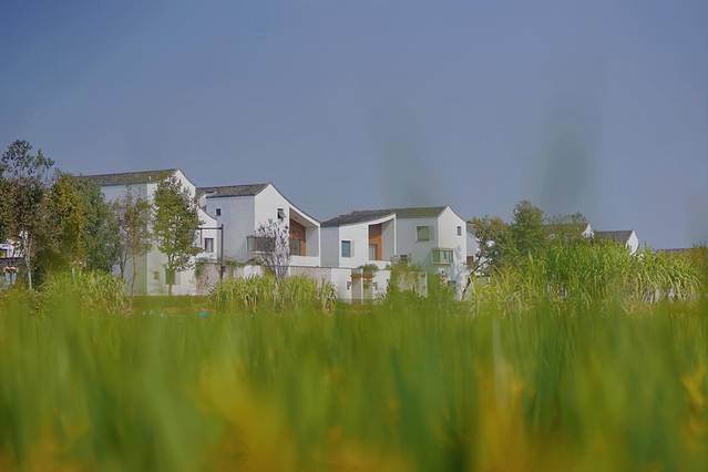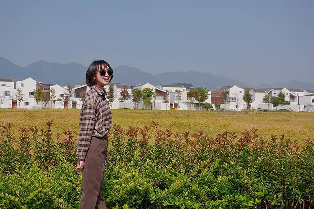 游客服务中心位于村子最外围,旁边看过去就是一整片稻田,稻田身后,伫立在群山的背景当中的,便是整齐划一的杭派民宿群。白墙灰瓦构成了建筑的主题色调,外部装饰不像徽派那样繁复,这些建筑更像是具有传统风骨的现代建筑,原木色的点缀于眼前的稻田形成了呼应,笔直的线条感之中透露出一种简约之美。