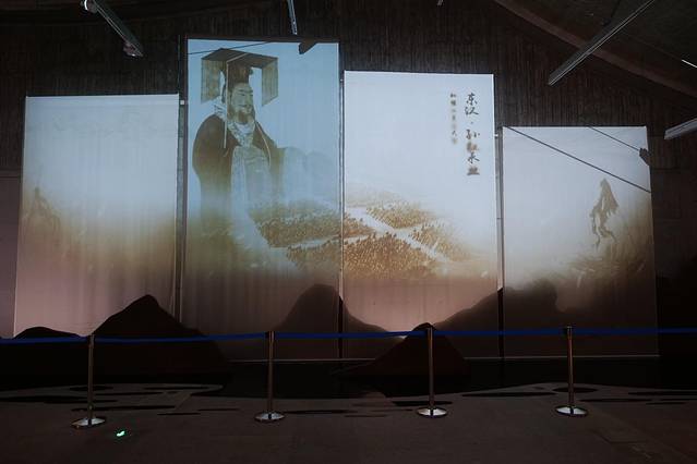 一进入序厅,映入眼帘的是四幅尺寸巨大的山水立轴,用投影仪播放视频的形式简单梳理富阳的发展历程,一幅中国传统山水画徐徐展开、娓娓道来。在山水立轴前, 用石板和聚乙烯材料模仿富阳山水,与视频中的山水美景形成了极好的呼应。