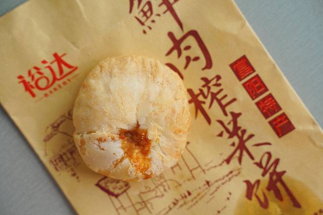 刚出炉的鲜肉榨菜饼最为诱人,大排长龙的食客,往往在刚出炉几分钟就将月饼抢购一空。经过约23分钟的烘烤,烤至金黄酥脆的外壳一口咬下就碎裂开来,忙不迭接住碎渣的同时,唇齿触碰到了那内里鲜美的肉香。越咀嚼,一股鲜美的肉香缓缓充溢口腔,这种鲜肉榨菜饼,其实起源于传统的苏式鲜肉月饼。肉一定要选择更有弹性和嚼劲的腿肉,三分肥七分瘦相当讲究。榨菜祛除了肉的腥气,肉的油脂又丰满了榨菜的味道,两者相得益彰激发了绝妙的味觉感受。