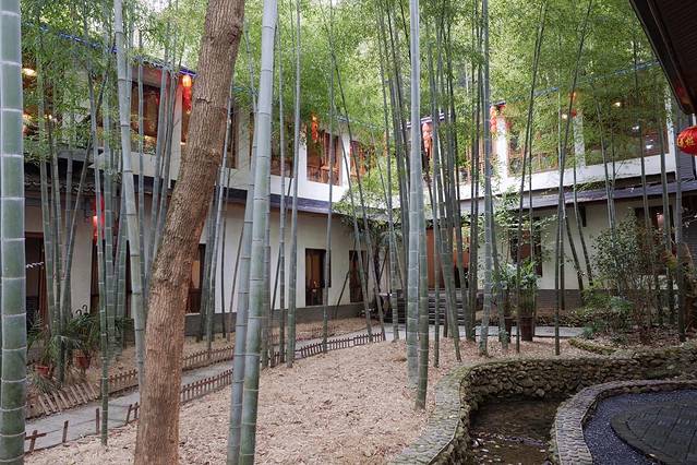 这家店位于黄公望隐居地大门口对面,地理位置相当优越,店里简直就是一个小型的竹林花园。竹林、水塘、石子路一样都不少,整齐排列的一个个大小包厢相当私密,纯中式的装修风格和整体的意境浑然一体。