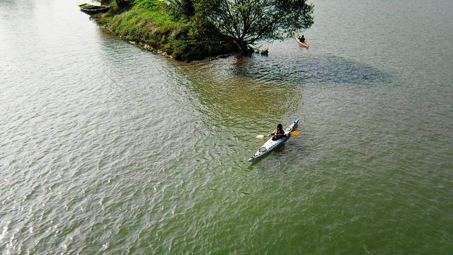 桐洲岛这一段江面,一年中除梅雨季节,水流都比较平缓,因此更加适合皮划艇、浆板一类的水上运动。江面上有一处非常小的凸起,使得合围的区域江湾非常平静,很适合收起船桨静静享受阳光的照耀和水面的漂浮感。如果想要更多的观景,可以划船穿过大桥,另一面的江面更加开阔,也更能体会到“人在画中游”的感觉。