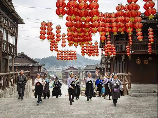 高硐村寨子中央的广场上伫着一座巨型芦笙雕塑,一栋栋依山而建的特色民居,挂满火红的灯笼串,村民们正认真细致的制作蜡染服饰。