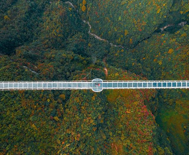 虽然云顶飞渡玻璃桥不是彩林的最佳观赏点,但是整个项目本身就自带吸引属性。这是一个拥有两个世界之最的玻璃桥,横跨峡谷,远看极为震撼,近身体验更为刺激。
