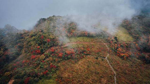 沿着绝壁前行,拜访千年红豆杉,山下成片彩林掩映,只能用惊艳形容。红的枫、绿的柏、黄的珙桐、橘红的槭叶……不断涌漫的山雾,一副大自然的天然画卷。
