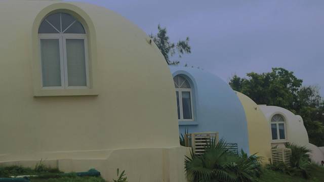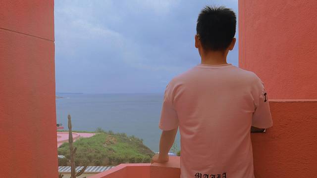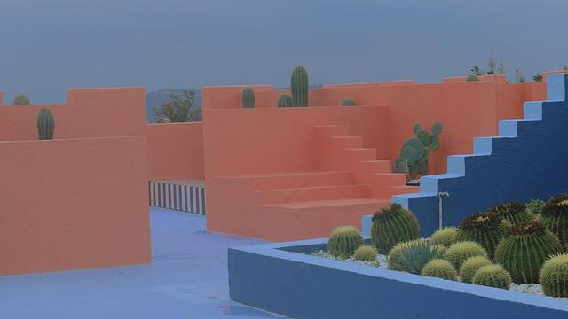 粉红色墙壁,绿色仙人掌,冰蓝色楼梯,