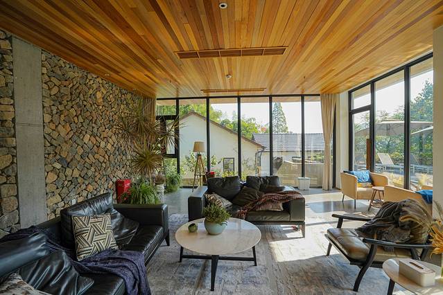 民宿的大堂区域我个人觉得更偏美式风格,皮质的沙发搭配冬日暖暖的壁炉,设计感十足。又搭配了一些乡村独有的装饰品,例如石头、木头堆砌的装饰墙面,干花插花等等,现代风与乡村风相互碰撞搭配的意外融洽。