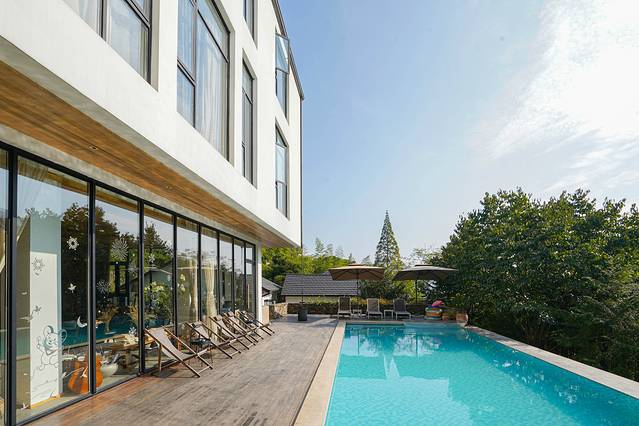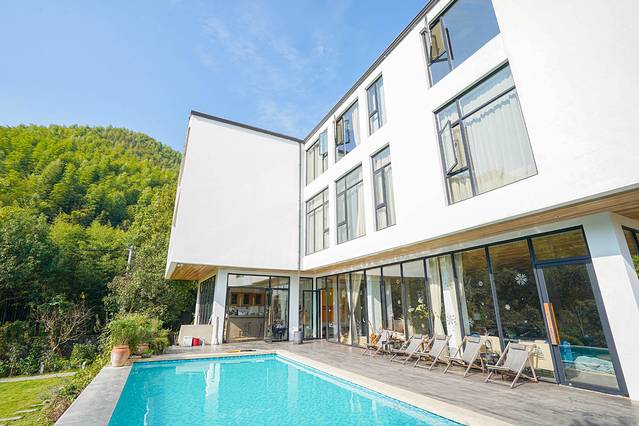 走过曲径通幽的走廊,便来到了民宿所在院子里,白色的尖顶房屋,大大的泳池,充满了时尚和设计感,又不缺度假民宿的氛围。