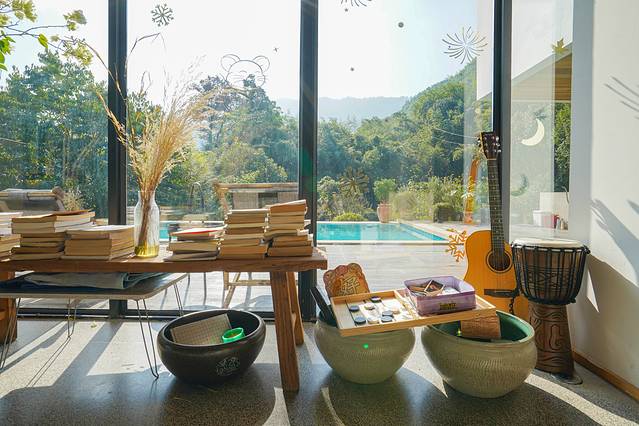 因为三面透光,所以躺在床上、浴缸中,坐在阳台上都可以欣赏到环抱民宿的大竹海,绝对是放松身心的好地方。