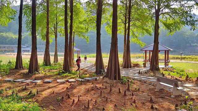 很多人会把落羽杉误认为是水杉,其实水杉与落羽杉并不难区分,落羽杉四周的地面上会冒出许多呼吸根,蕉岭县皇佑笔皇佑庵旁边落羽杉的呼吸根因为很像一尊尊小佛像,所以被人们称为“佛根”。泮坑落羽杉的地面上也有不少“佛根”。