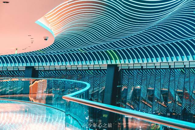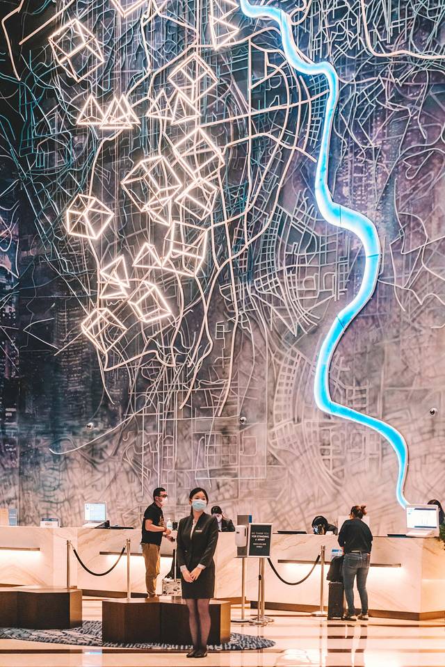 罗湖与香港之间隔着深圳河,而这一独一无二的地理标识被万丽艺术般地搬到了大堂前台,并以电子蓝光演绎,配以周边是四通八达的交通线路,以及悬挂空中的3D几何方块,让人惊叹其科幻感十足的同时,也感受到酒店设计的用心之处:品牌不再是千篇一律的复制粘贴,而是因地制宜的匠心创作。