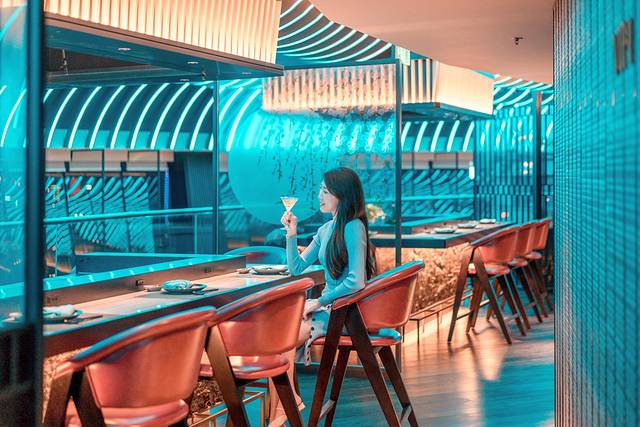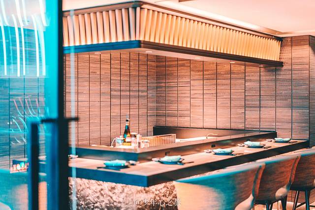 渡月桥,谁起的名字,如此诗情画意,而景如其名,唯美梦幻的就餐环境,艺术元素俯拾皆是。这一层主打的是高端日料,是铁板烧、刺身的天堂,挪威三文鱼、日本甜虾、北极贝、日式凉面等日料都可以在吃品尝到,不仅料理现场制作,还有大厨魔术般的刀叉表演。