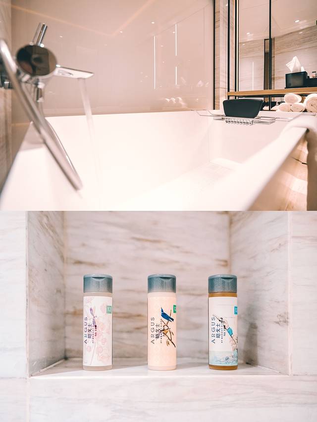 泡一个热水澡也是奔波旅途中能够迅速回血的一种方式, 浴室内洗发水、沐浴露、身体乳、肥皂等洗漱用品都是高端品牌ARGUS(阿古斯)的,宽敞明亮的空间,恰到好处的细节,都给人留下极好的沐浴体验。