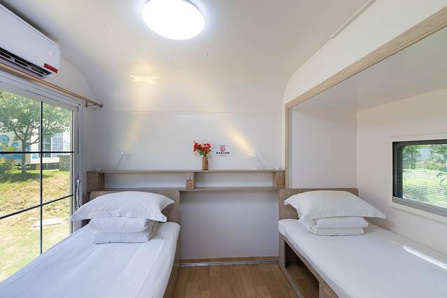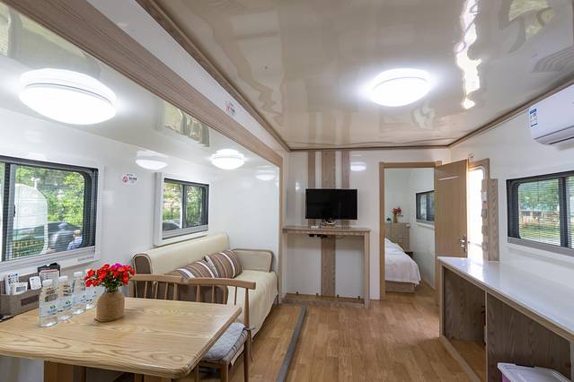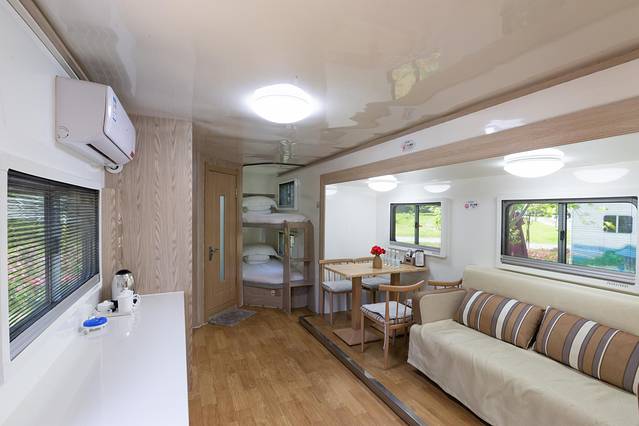 房车内部的空间也是比较大的,不同房型,可以满足带娃带家庭出游的需要,而且房车内部的公共空间很舒服,宽敞明亮,装修也是浅色系,让人一进来就感觉很豁然开朗而不是很压抑的感觉。