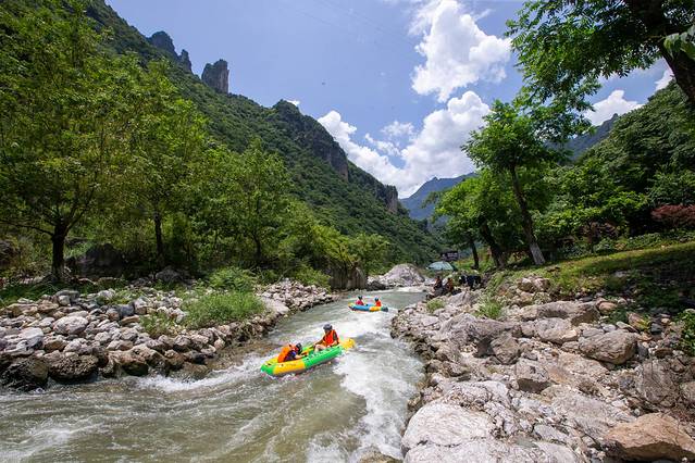 朝天吼已经不是第一次去了,夏天的时候去朝天吼,主要是冲着闻名遐迩的朝天吼漂流而去的,刚刚说了朝天吼位于“一江两山”黄金旅游通道之上,地理环境那是相当适合漂流。我们现在可以漂的一段有6.5公里长,但落差却有148米,可以说是国内刺激程度排名前十的漂流项目了!在漂流的途中,还可以欣赏卧佛山、八缎锦、将军柱、朝天吼等壮丽的祖国江山美如画。