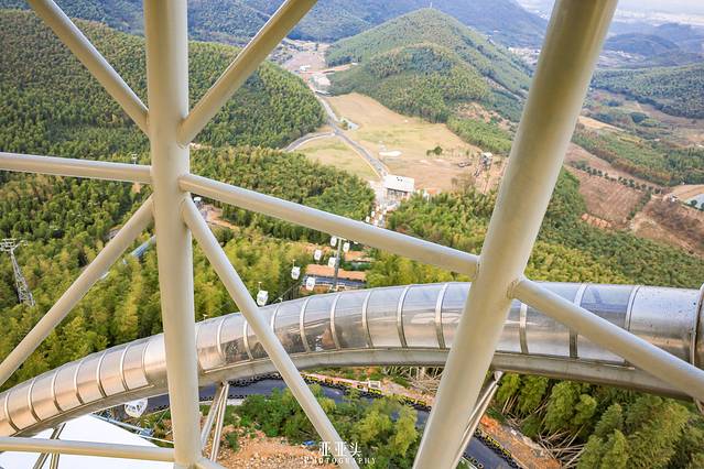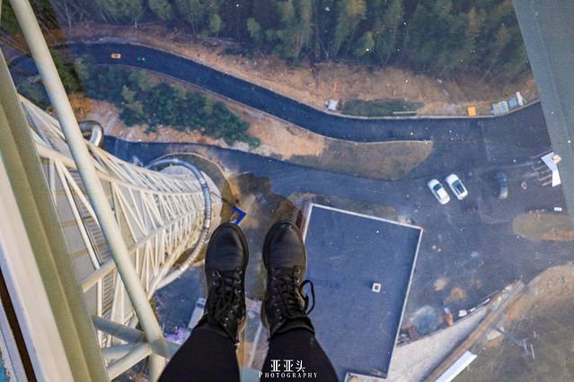 天际探险塔上的天际景观台采用了36mm的防弹玻璃,安全有保障,姐妹们可以放心感受刺激!不过外挑50m,落差200m的高度让我还没上去体验就已经望而却步了。站在塔顶观光台上,俯瞰整个园区,你能感受到一览众山小的雄浑景观,感受辽阔的天地。
