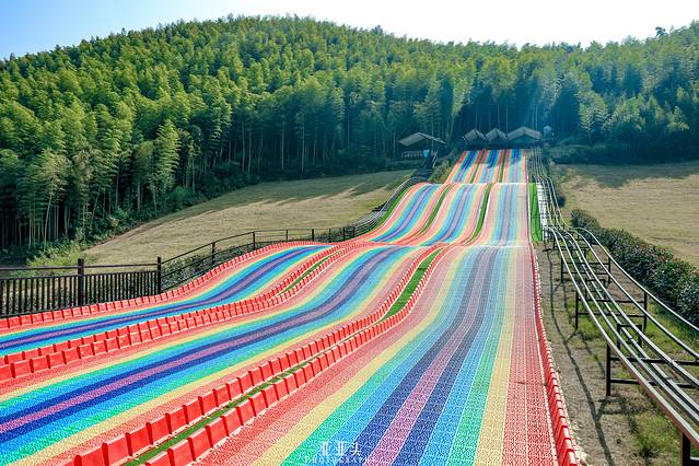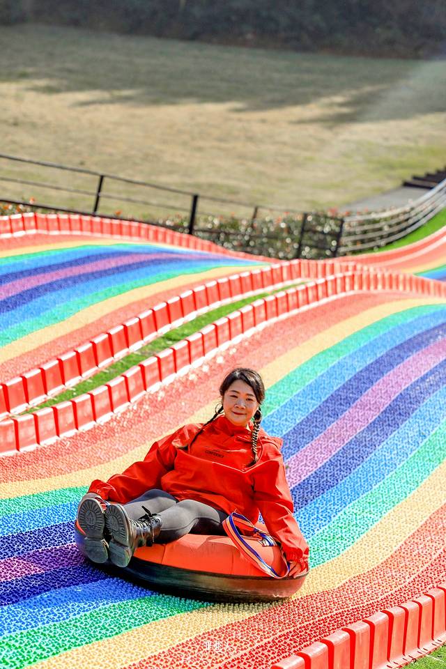 这里是像彩虹一样绚丽多彩的滑道,坐上轮圈,从高高的坡上一滑而下,跌宕起伏的滑道给刺激感加分。悄悄探出的阳光照射在旁边的一整片花海和风车上,显得格外明媚动人。