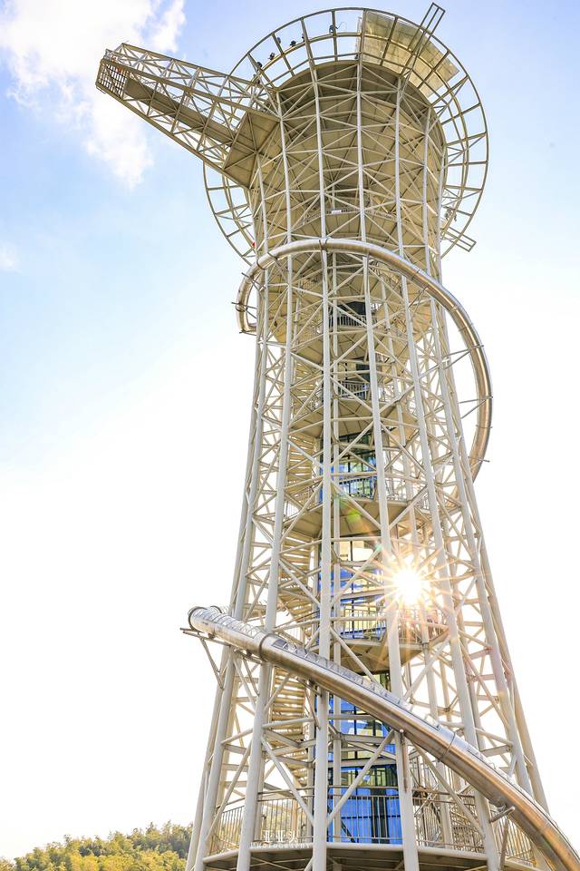 就像是一个加长版的滑滑梯,360°环绕在探险塔上,感受身体急速下坠的惊险感,刺激但不会过分吓人。