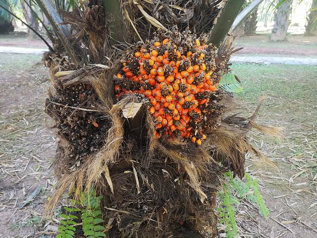 这是棕榈科植物油棕的果实,在一片绿中很显眼。