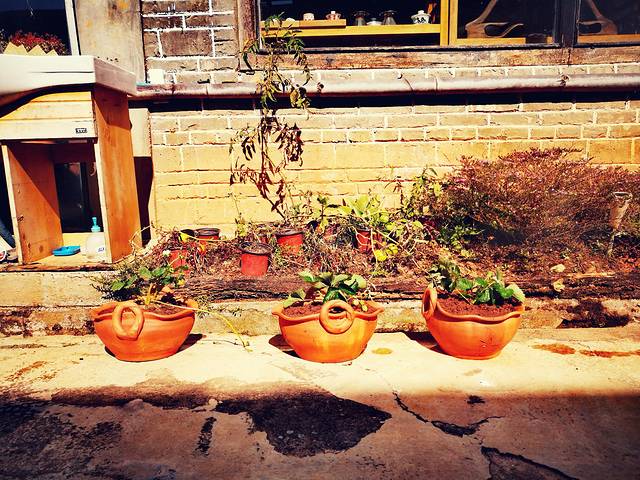 三颗草莓苗不一会儿被种到了从曼飞龙村买的陶盆里,放到墙根下,一道迷你小风景新鲜出炉。