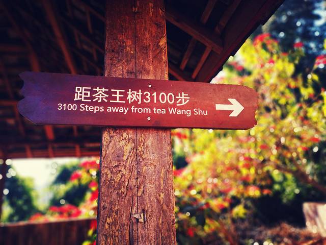 这里看到的标识牌,距离茶王树还要走3100步。按照成年人步幅约75cm算,大约2.3公里。