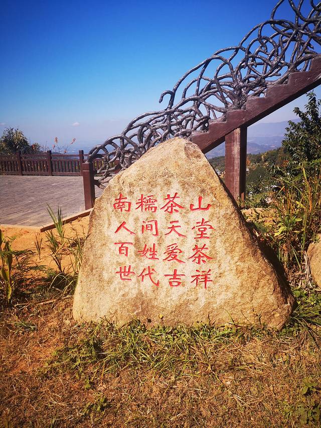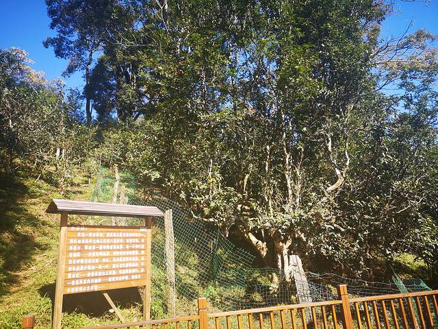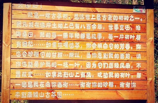 上图是此行的终点,800年树龄的茶王,并没有想象中的高大,就是绿网围起来的那一小棵,倒是旁边木牌上的一段话,为这风景添了些色彩,我把原文的图贴出来,供感兴趣的盆友品味。