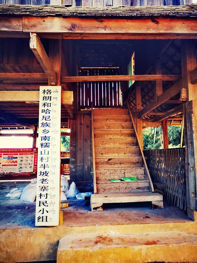 我要参观的这栋楼就是哈尼族人建造的,现在用来经营民宿,但功能布局和外观都属于典型的干栏式建筑,一楼架空不住人,客房全在二楼。