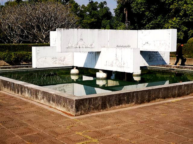 一组是周总理纪念碑,入园后游客经过一条长长的中轴对称的植物带,视线尽头就是这块纪念碑,它是用橡胶树幼苗的形状为灵感来做的设计,上面有少数民族载歌载舞的浮雕,写有汉傣双语。