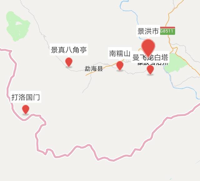 由于曼飞龙和景真分别位于景洪市的西南和正南方向,看下图标记就一目了然,所以第四天一早先去曼飞龙,景真寨在勐海县,后面去的南糯山,勐景来,打洛都属于勐海县,景真八角亭就安排在去打洛的途中一并游览。