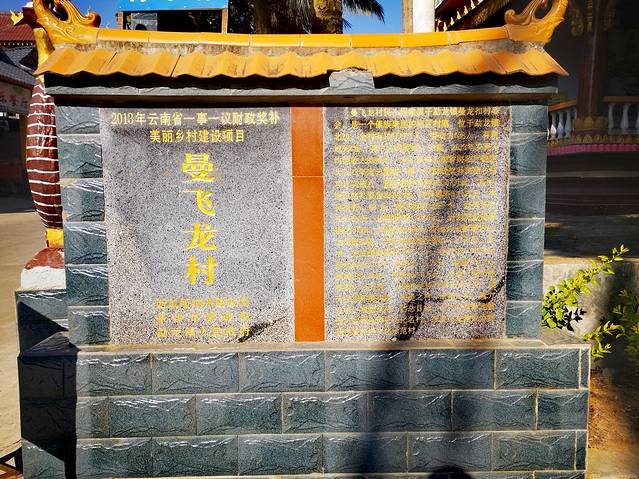 从大门进去之后右前方有一块石碑,石碑上介绍曼飞龙村有150多户人家,770多人口。村子隶属于景洪市大勐龙镇,距离缅甸约30公里。