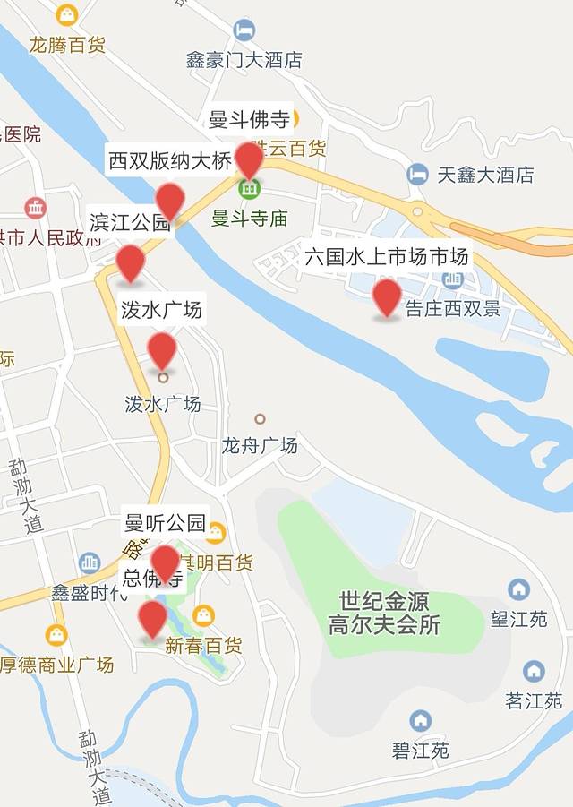 过了西双版纳大桥,再走一刻钟,经过曼斗,就是告庄西双景。