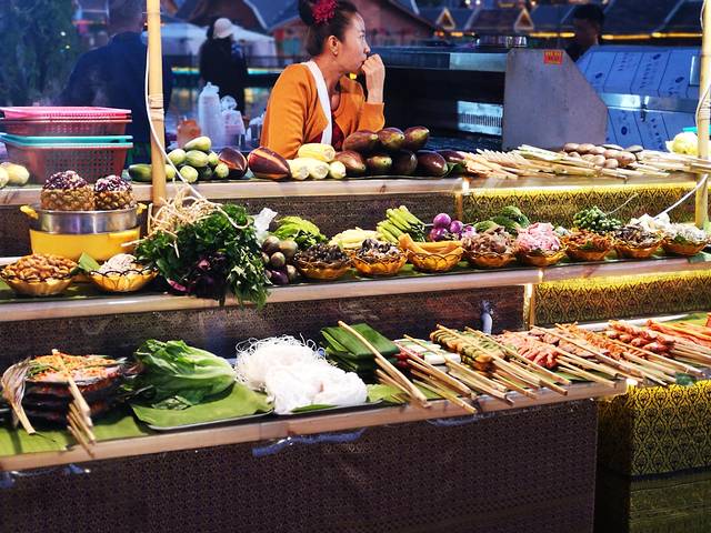 告庄夜市除了大,人气也旺,当然来玩儿的多数是游客(据说本地人去滨江夜市的比较多)经营者听口音主要是傣族人和东北人,前面说了因为景洪冬天不冷,吸引不少东北人来过冬,顺带也吸纳一波东北人来做生意,所以逛夜市不仅能吃到地道的傣式烧烤,还有正宗的现包东北水饺。
