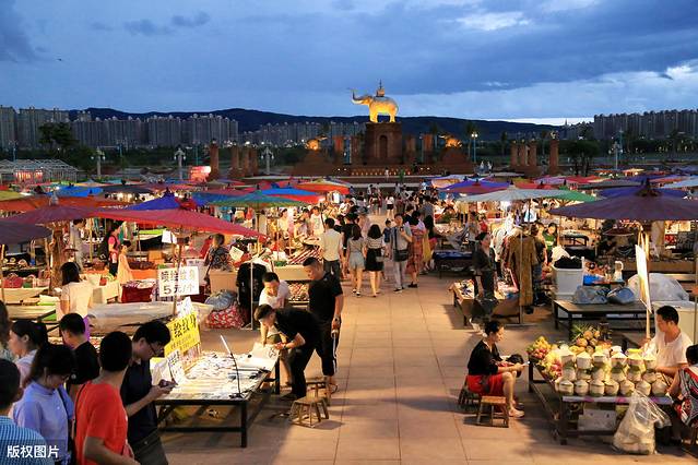 告庄夜市因傣味和东北味共存,反而有点南北交融的味道,穿梭在一个个小摊位,点一份傣式菜包鱼,吃一碗东北水饺,喝一杯鲜榨果汁,听商贩们用软糯的傣普或浑厚的东北话招揽顾客,吃饱喝足逛累了返程的路上再欣赏一番告庄夜景,夜游景洪就算完美了。