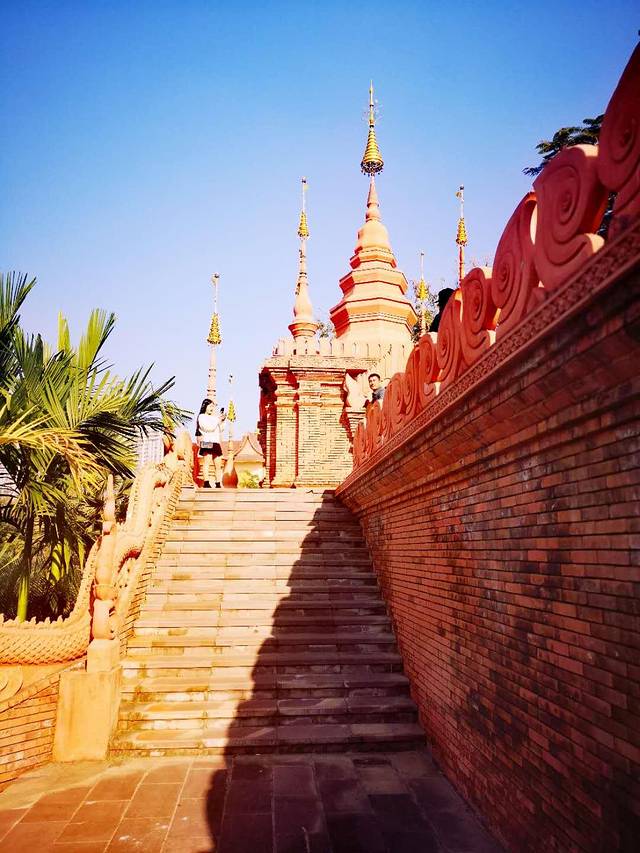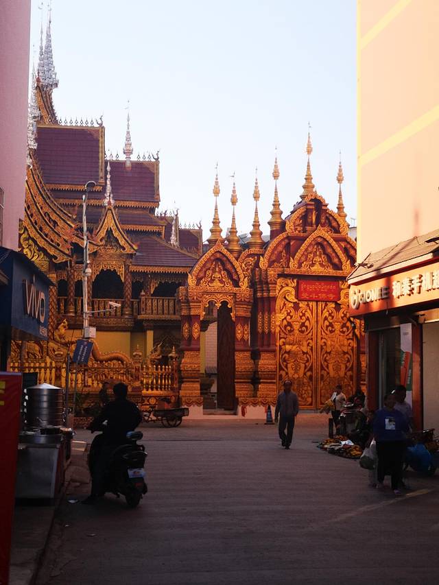 曼斗这个社区非常接地气,沿途一路各种水果店,小吃摊,美容美发,烧烤,日用百货……充满市井生活气息,非常热闹,就在这么接地气的氛围里有一座我看来格格不入的建筑,就是曼斗佛寺,它在这样的环境中太显眼了,下面这张图就是我身处嘈杂闹市,回头遥望曼斗佛寺的定格,你们看这建筑盖的竟然比路还宽