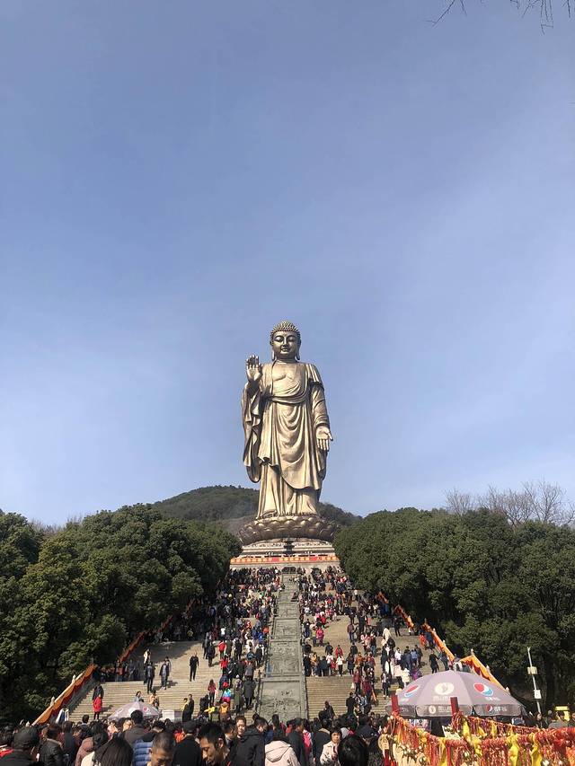 通往灵山大佛一共有218级台阶。第1个108阶台阶,表示去除你108个烦恼,第2个108级台阶,表示满足你108个愿望。上去之后可以做电梯去“抱佛脚”,节日期间人山人海,抱佛脚需要等待40分钟,放弃了临时“抱佛脚”的想法笑哭。