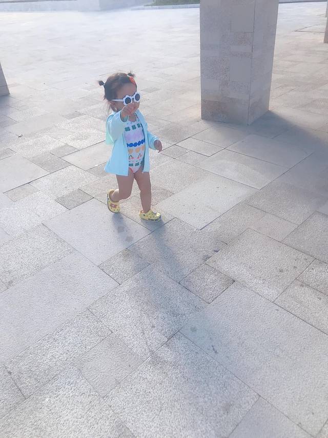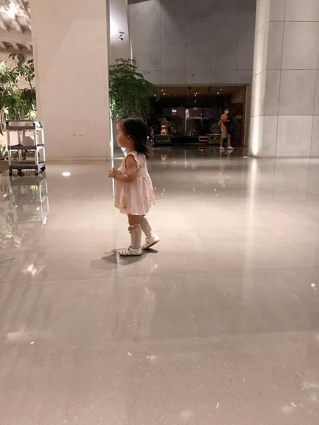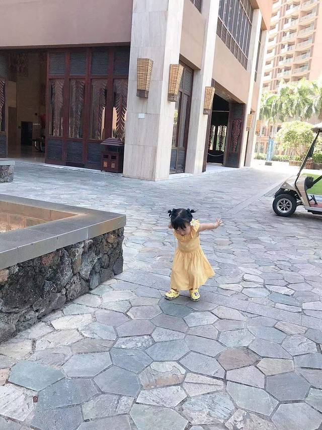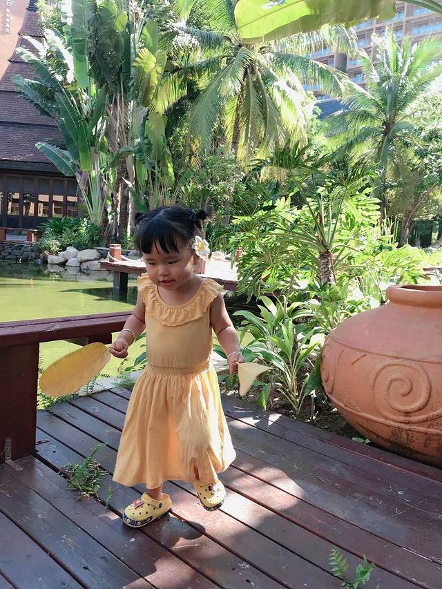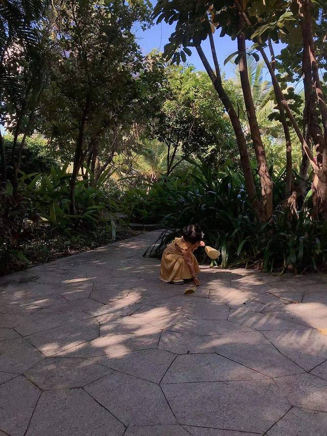 第二天,我们一家三口睡到了太阳晒屁股,8点多醒来去餐厅吃个早饭,慢悠悠在酒店园区溜了会娃,拍了照,感受到了热带植物园林的风貌,满眼鲜翠欲滴的绿色,碎金般的阳光洒在密实柔软的草地上,清新的露珠也闪闪发光。第一次见到阔叶林热带植物的小家伙很兴奋,东南亚风情建筑的酒店也吸引了她的目光,到处转悠,就是不配合爸爸妈妈拍照,有点洁癖的小东西不愿意踩草地,令人头大!此处标记:一定要带可登机的折叠婴儿伞车,不然全程抱着吧!