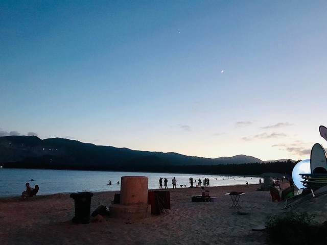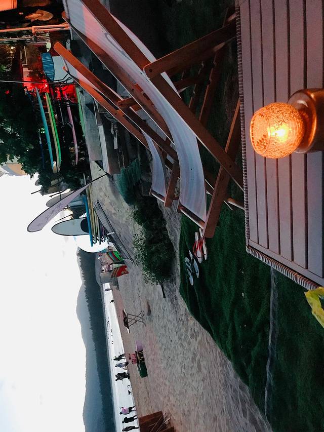 吃罢午饭,小家伙午睡了一小时,我们购票,就普通的环岛游,中途不下那种,坐着小丑鱼车环岛观光了一圈,爬上了陡峭的山坡,观海观景,车子在山壁丛林间穿梭也挺神奇的。小家伙一路很安静的看着周遭风景。时间有限,我们还想去后海冲浪,就下了岛,游轮返回码头,步行几分钟到了后海村,后海村一条街都是小吃,店铺琳琅满目还是挺便利的,海边的冲浪俱乐部,挤满了老外,喝酒,聊天,冲浪,蹦迪,超嗨!我们都达后海村已经下午三四点,询问了几家店铺,价格都稍贵,动辄一个人四五百。因为提前打听了价格,听了别人建议,我们淘宝联系了一个教练,时间晚价格就便宜,一个人150左右,后海海面平静,浪小,很适合初学者,不需要教练教学,你都可以自己体验。我们就对教练说,给我们一个板,怎么快怎么教,我们自己划着玩。到时间来收板就行。