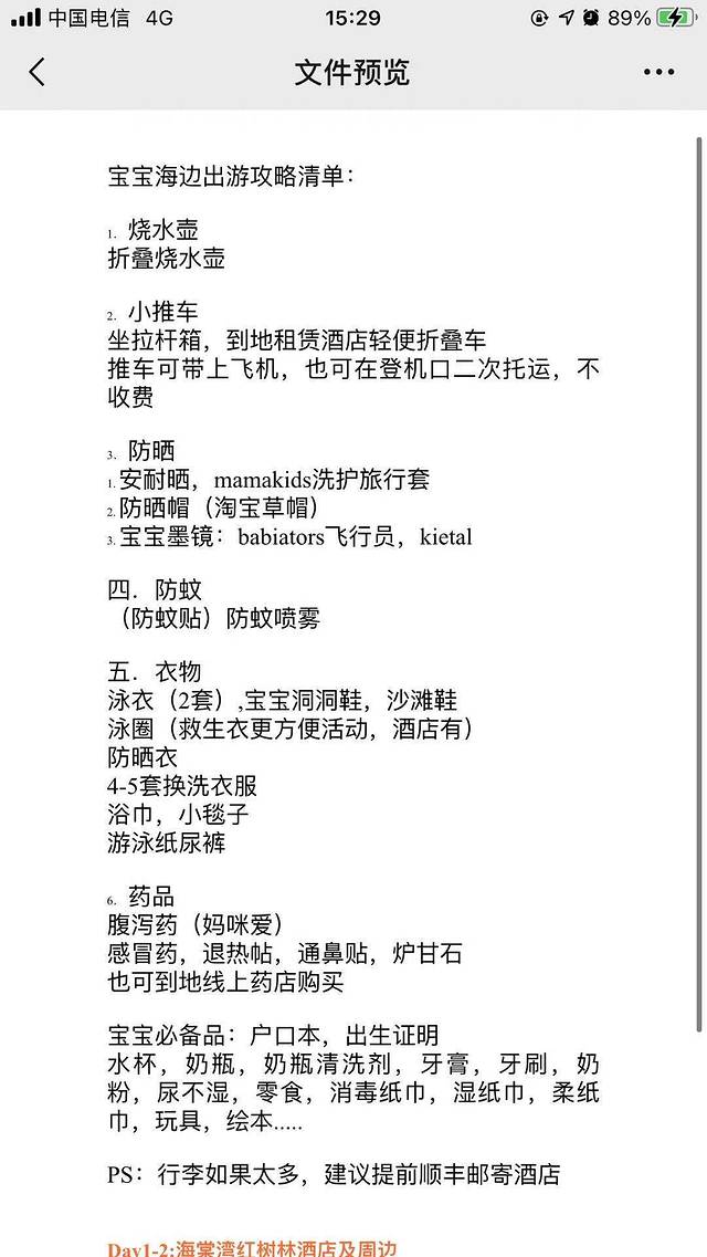 提前做了粗略计划,最多的出行前准备工作是给宝宝准备随行物品,装箱安检,婴儿车登机或托运等。为此,提前两周,老母亲列了清单,在时间有限的情况下才能按照清单高效收拾行李,以防遗漏,有娃的都懂,完全的准备才是带娃出行的必备条件,不然手忙脚乱影响整个行程的心情,在人生地不熟尤其价不熟的地,还是提前预备携带的好!