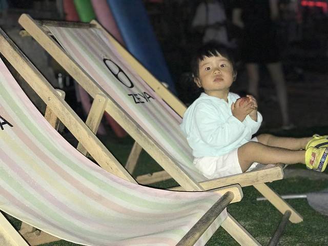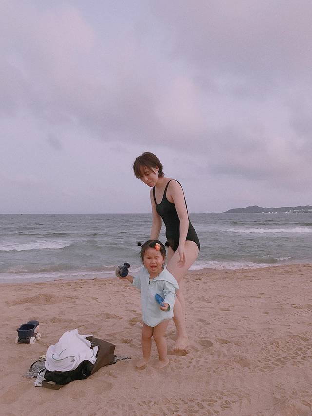 爸爸充电一小时后回来,娃还没醒,俩人坐等娃睡醒后,下海挖沙,下海踩浪,由于天色太晚,爸爸的冲浪梦没达成!