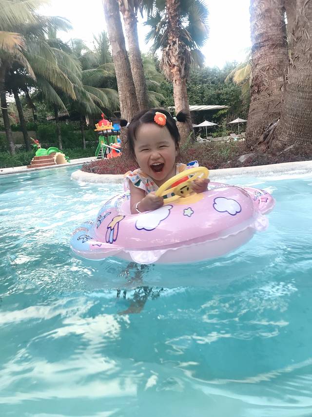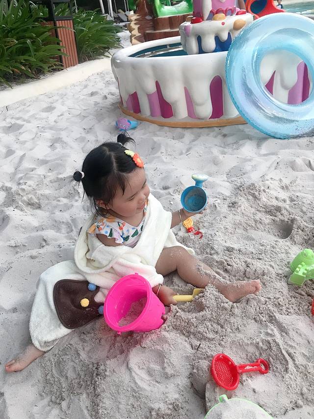 爸爸在跟酒店服务人员磨嘴皮子的空,小家伙已经开始了欢快的旅程!终于顺利入住,放好了行李,换了泳衣直奔酒店泳池,去玩水、挖沙!
