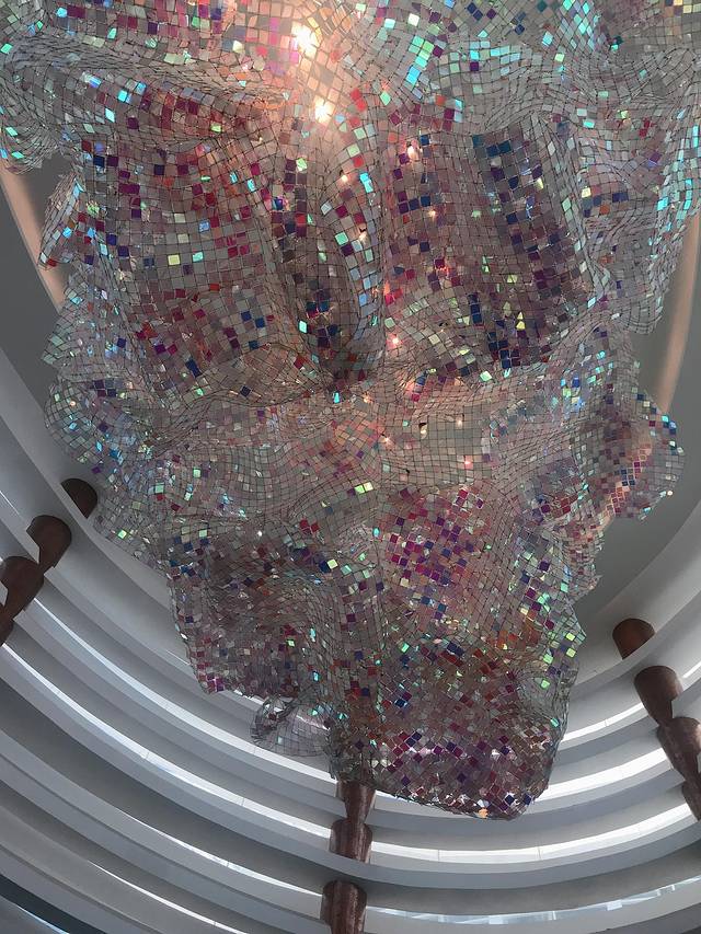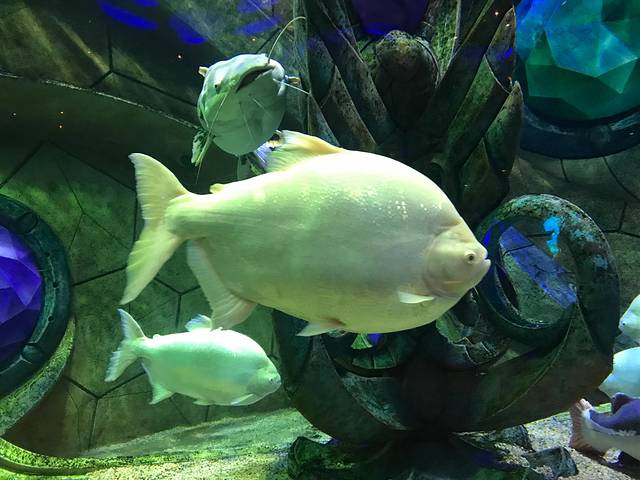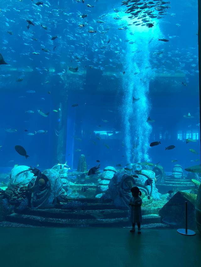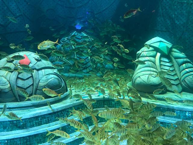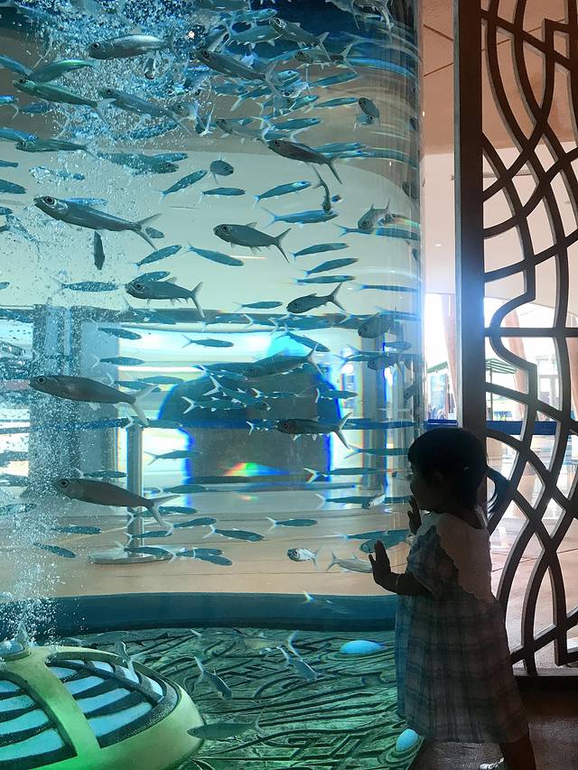 一进去就被高大上的酒店逼格吸引了,水世界门口打卡后,直接进去逛,不愧是遗失的水世界主题,神秘的图腾建筑,绿色的古铜雕塑仿佛天外来兵。一下子吸引你沉浸幻想在一个未知的世界,畅游海底三万里。巨大的透明落地水箱,足足两层楼高,各种海洋生物在里面游荡,自由自在。碧蓝的海水漂浮着光影,一簇簇光线穿透水面映射水底,鱼群们穿荡其中,气定神闲,太让人放松了!