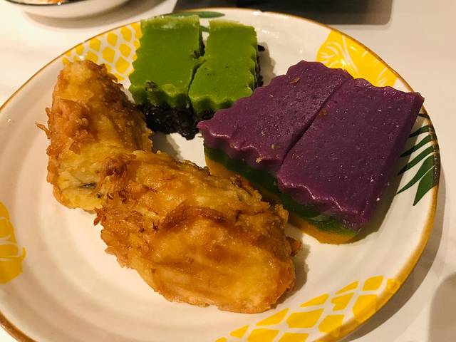到了晚饭时间,爸爸就搜索了万宁有名的网红南洋风味餐厅——兴隆南洋风味,从石梅湾驱车20分钟左右去吃晚饭!排队一小时(还是淡季),座无虚席,小家伙在店里玩了会,店铺环境很赞,风格独特,大红大绿的配色很有南洋风格。餐食是小吃类型,一小盘一小盘,但是分量挺足,两个人可以点个六七盘多尝种类!我们去的稍晚,很多网红品类直接售完,但也不影响味蕾享受美食的冲击,真的每一道都很惊艳,打开了味觉新世界的大门!