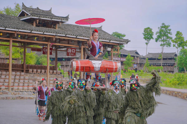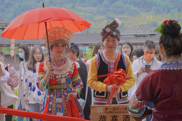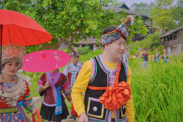 第二天前往融水县的梦呜苗寨,在这不仅可以了解苗家习俗还能亲身参与现场表演,演出以苗寨为舞台进行实体演出,从一开始的芦笙舞到对唱山歌,再到最后的苗家婚礼都通过演出和游人互动的形式,向大家展示了苗家的独特风俗,现场的体验感简直拉满!
